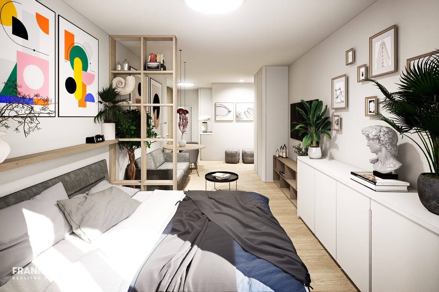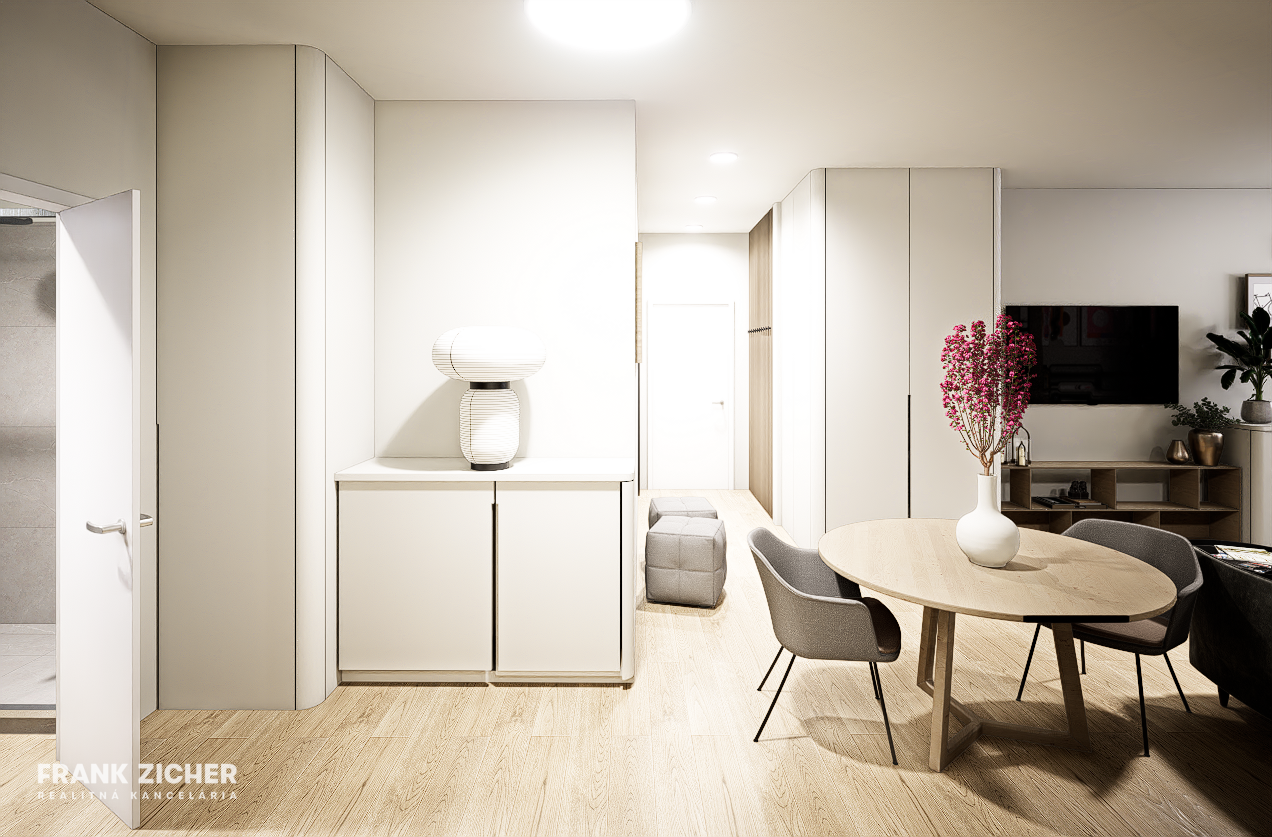 Vstupná chodba, kúpeľňa so sprchovacím kútom a WC, hlavná obytná miestnosť s kuchynským kútom, jedálenským stolom a zónou na spanie.